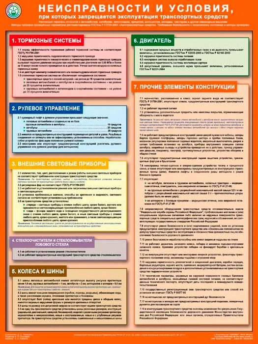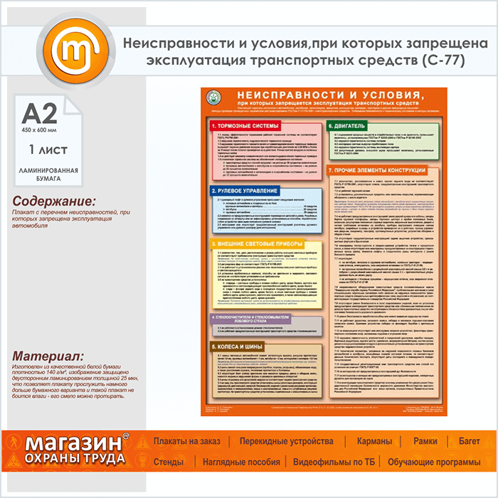 Плакат «Неисправности и условия, при которых запрещена эксплуатация транспортных средств» (С-77, ламинированная бумага, А2, 1 лист) в Красноярске купить