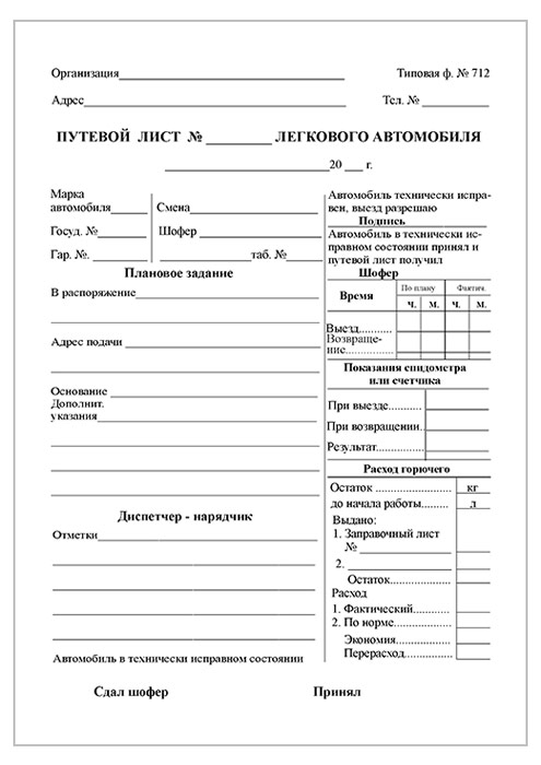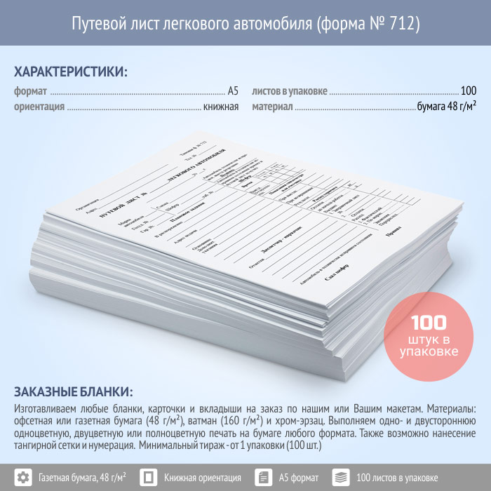 Путевой лист легкового автомобиля (форма № 712, упаковка из 100 штук) в Красноярске купить