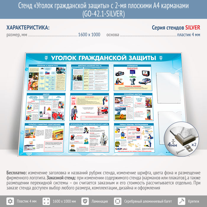 Стенд «Уголок гражданской защиты» с 2-мя плоскими А4 карманами (GO-42.1-SILVER) в Красноярске купить
