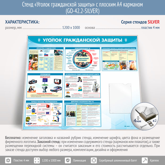 Стенд «Уголок гражданской защиты» с плоским А4 карманом (GO-42.2-SILVER) в Красноярске купить