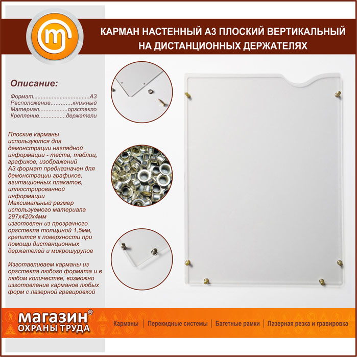 Карман настенный А3 плоский вертикальный на дистанционных держателях