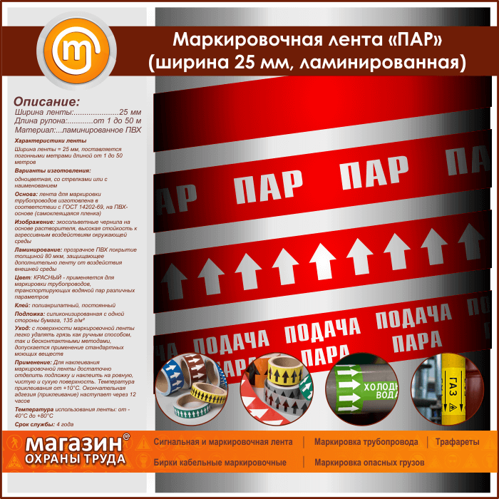 Маркировочная самоклеящаяся лента «ПАР» имеет КРАСНЫЙ цвет и применяется для маркировки трубопроводов, транспортирующих водяной пар различных параметров. Поставляется погонными метрами длиной от 1 до 50 метров. Изготавливается одноцветной, со стрелками или с наименованием