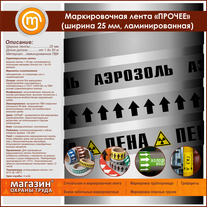 Маркировочная самоклеящаяся лента «ПРОЧИЕ ВЕЩЕСТВА» имеет СЕРЫЙ цвет и применяется для маркировки трубопроводов, транспортирующих вещества, не относящиеся к другим категориям. Поставляется погонными метрами длиной от 1 до 50 метров. Изготавливается одноцветной, со стрелками или с наименованием