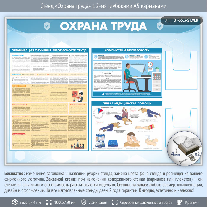 Стенд «Охрана труда» с 2-мя глубокими А5 карманами (OT-35.3-SILVER) в Красноярске купить