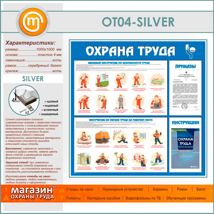 Стенд «Охрана труда» с плоским и объемным карманами (OT-04-SILVER) в Красноярске купить