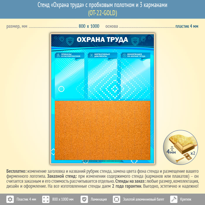 Стенд «Охрана труда» с пробковым полотном и 3 карманами (OT-22-GOLD) в Красноярске купить