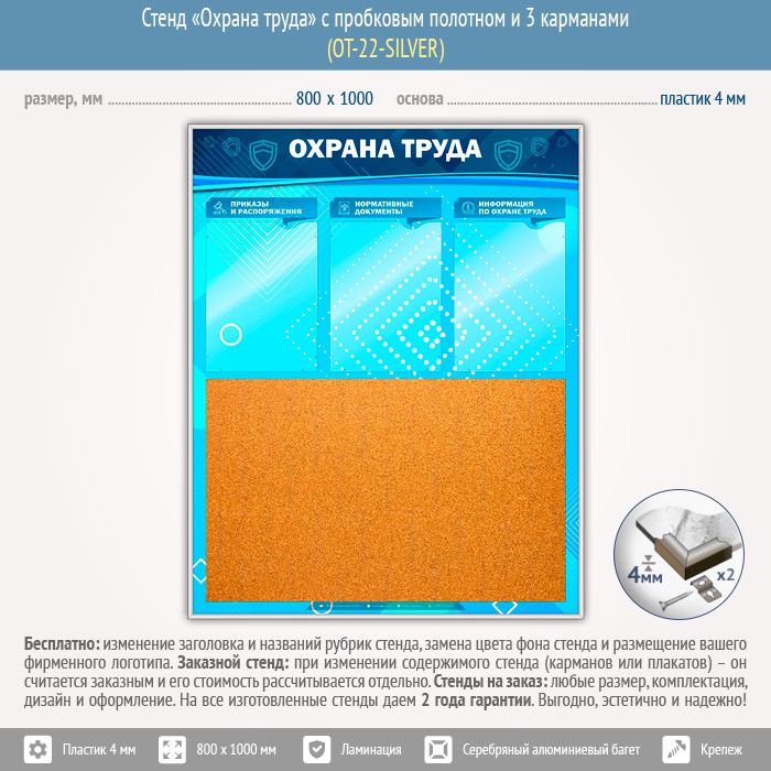 Стенд «Охрана труда» с пробковым полотном и 3 карманами (OT-22-SILVER) в Красноярске купить