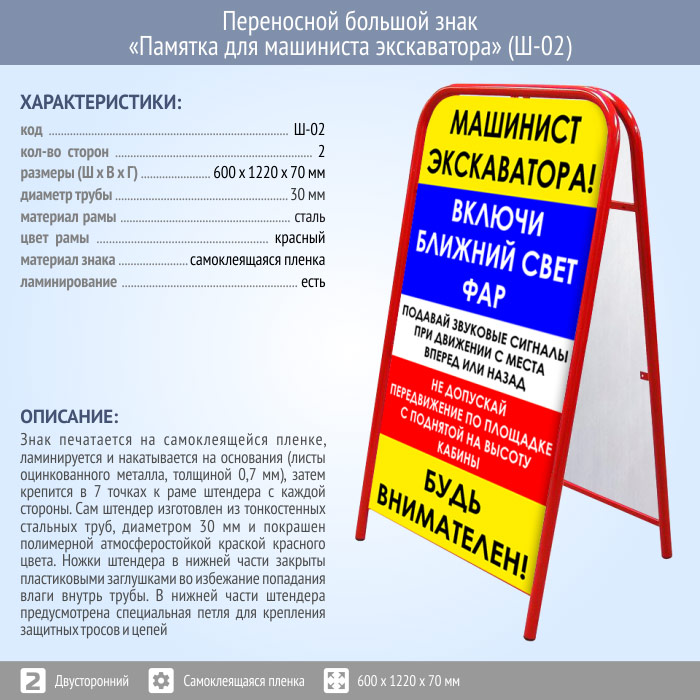 Переносной большой знак «Памятка для машиниста экскаватора» (Ш-02, двусторонний, самоклеящаяся пленка) в Красноярске купить