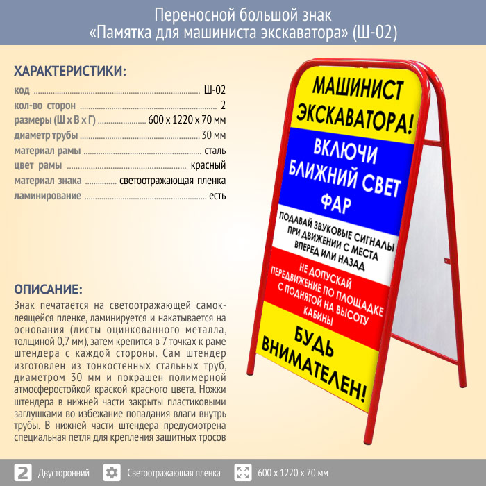 Переносной большой знак «Памятка для машиниста экскаватора» (Ш-02, двусторонний, светоотражающая пленка) в Красноярске купить