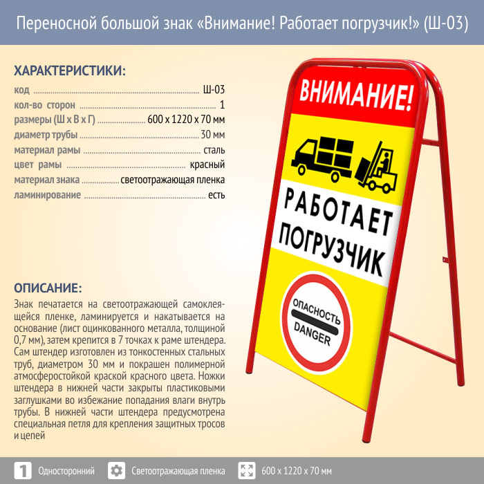 Переносной большой знак «Внимание! Работает погрузчик!» (Ш-03, односторонний, светоотражающая пленка) в Красноярске купить