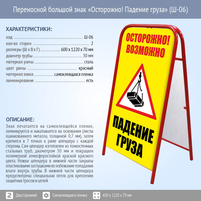 Переносной большой знак «Осторожно! Падение груза» (Ш-06, двусторонний, самоклеящаяся пленка) в Красноярске купить