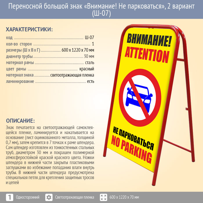 Переносной большой знак «Внимание! Не парковаться», 2 вариант (Ш-07, односторонний, светоотражающая пленка) в Красноярске купить