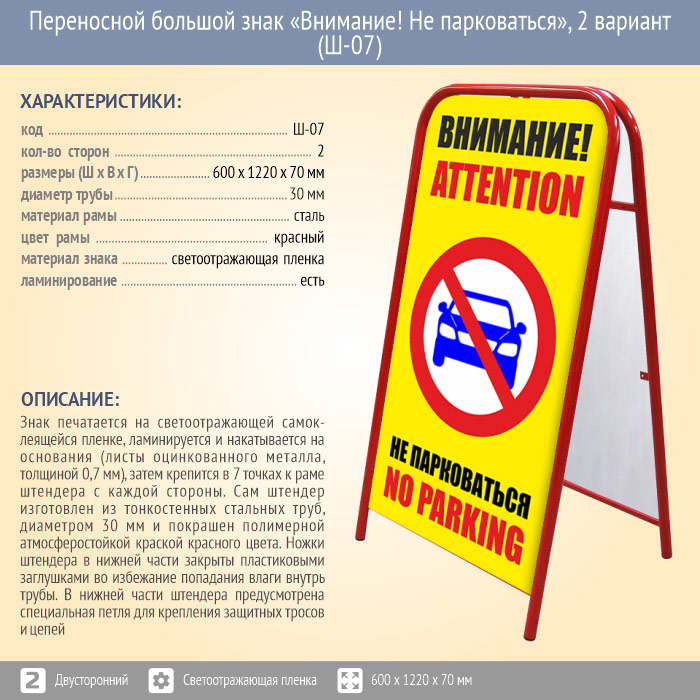 Переносной большой знак «Внимание! Не парковаться», 2 вариант (Ш-07, двусторонний, светоотражающая пленка) в Красноярске купить