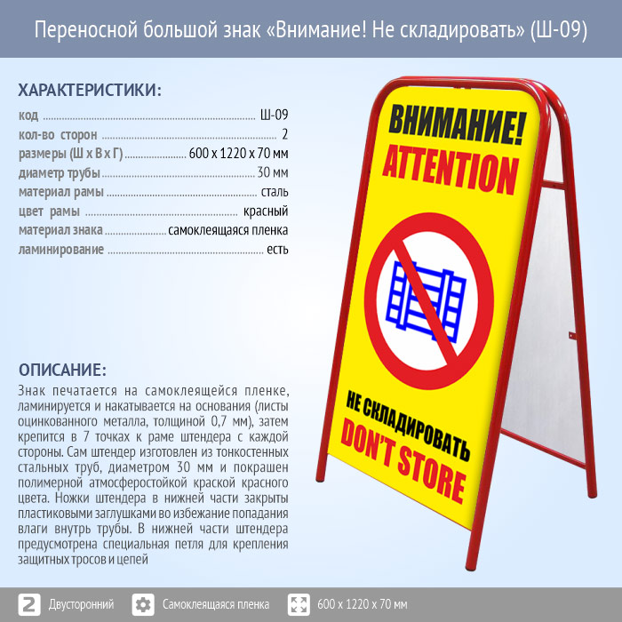 Переносной большой знак «Внимание! Не складировать» (Ш-09, двусторонний, самоклеящаяся пленка) в Красноярске купить