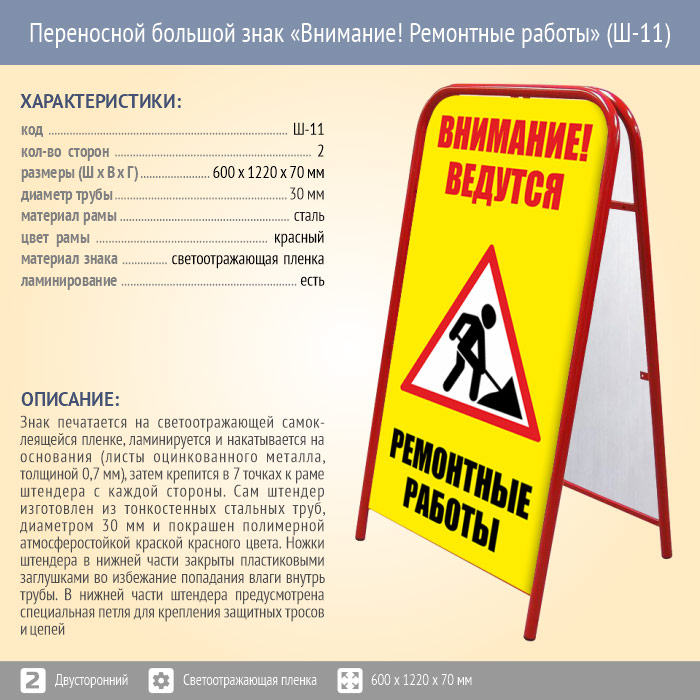 Переносной большой знак «Внимание! Ремонтные работы» (Ш-11, двусторонний, светоотражающая пленка) в Красноярске купить