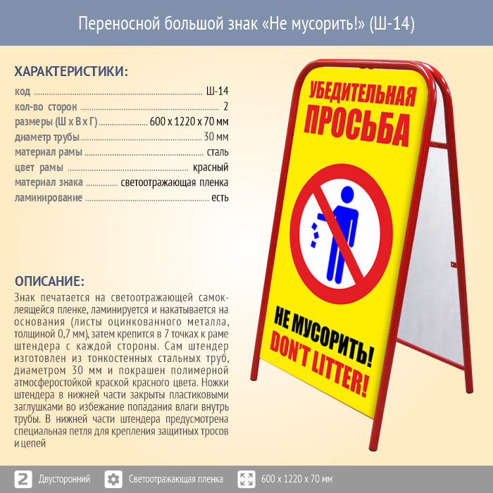 Переносной большой знак «Не мусорить!» (Ш-14, двусторонний, светоотражающая пленка) в Красноярске купить