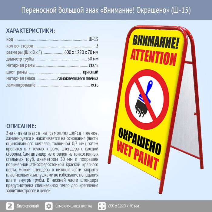 Переносной большой знак «Внимание! Окрашено» (Ш-15, двусторонний, самоклеящаяся пленка) в Красноярске купить