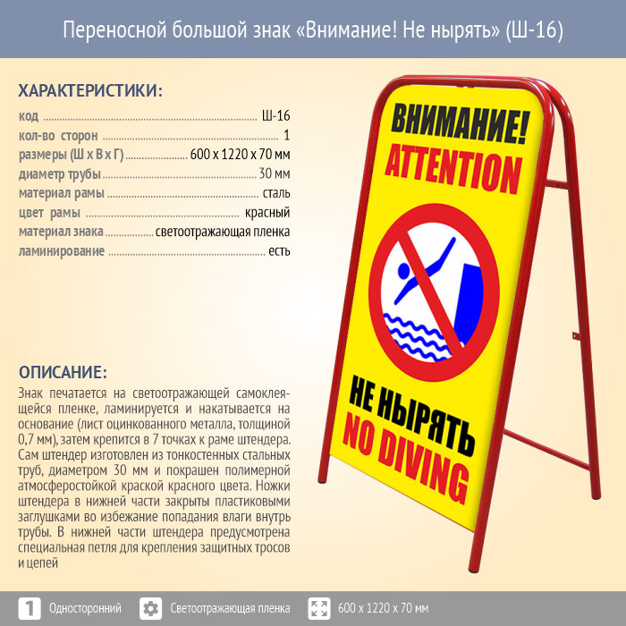 Переносной большой знак «Внимание! Не нырять» (Ш-16, односторонний, светоотражающая пленка) в Красноярске купить