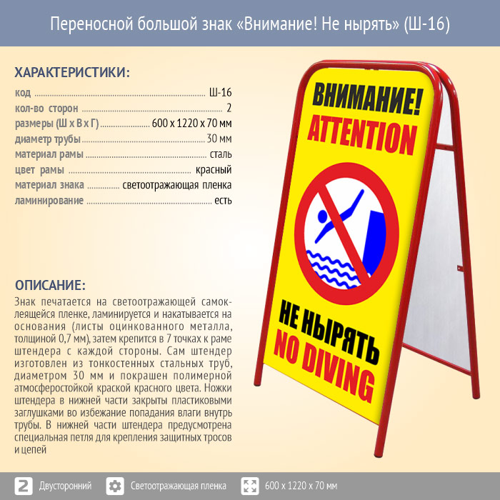 Переносной большой знак «Внимание! Не нырять» (Ш-16, двусторонний, светоотражающая пленка) в Красноярске купить