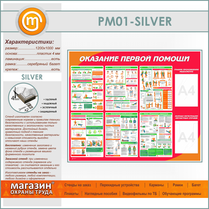 Стенд «Оказание первой помощи» с плоским и объемным карманами (PM-01-SILVER) в Красноярске купить