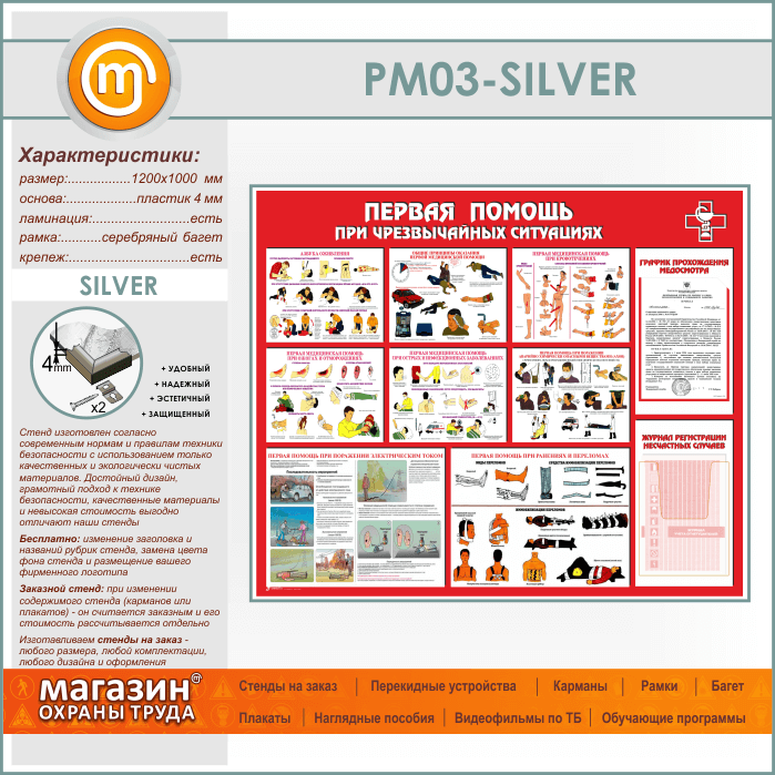 Стенд «Первая помощь при чрезвычайных ситуациях» с плоским и объемным карманами (PM-03-SILVER) в Красноярске купить