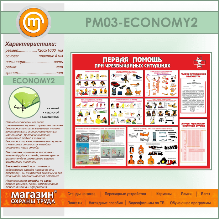 Стенд «Первая помощь при чрезвычайных ситуациях» с плоским и объемным карманами (PM-03-ECONOMY2) в Красноярске купить