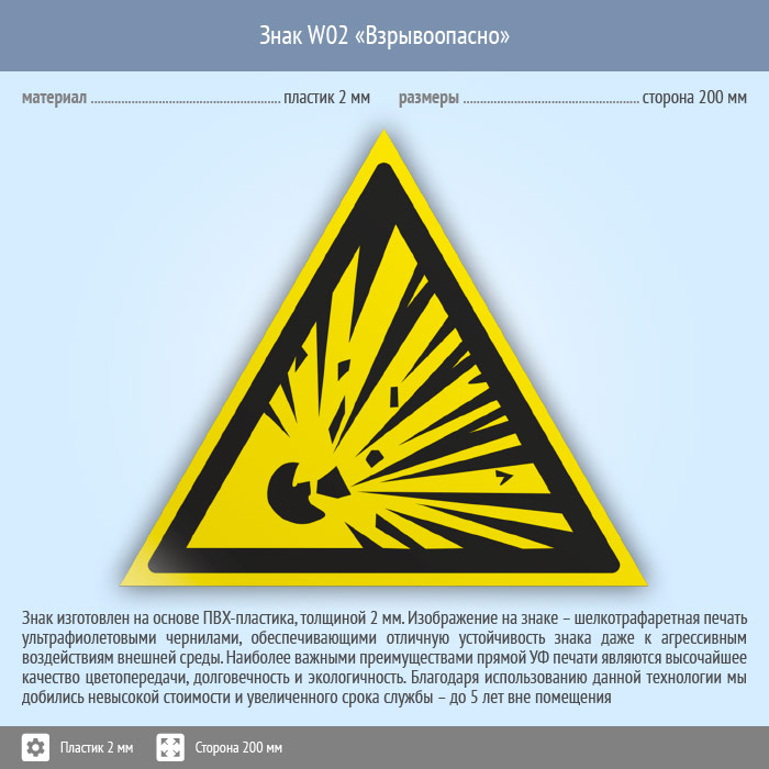 Знак W02 «Взрывоопасно» (пластик, сторона 200 мм) в Красноярске купить