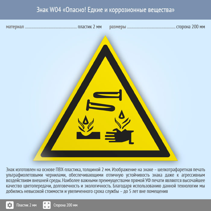 Знак W04 «Опасно! едкие и коррозионные вещества» (пластик, сторона 200 мм) в Красноярске купить