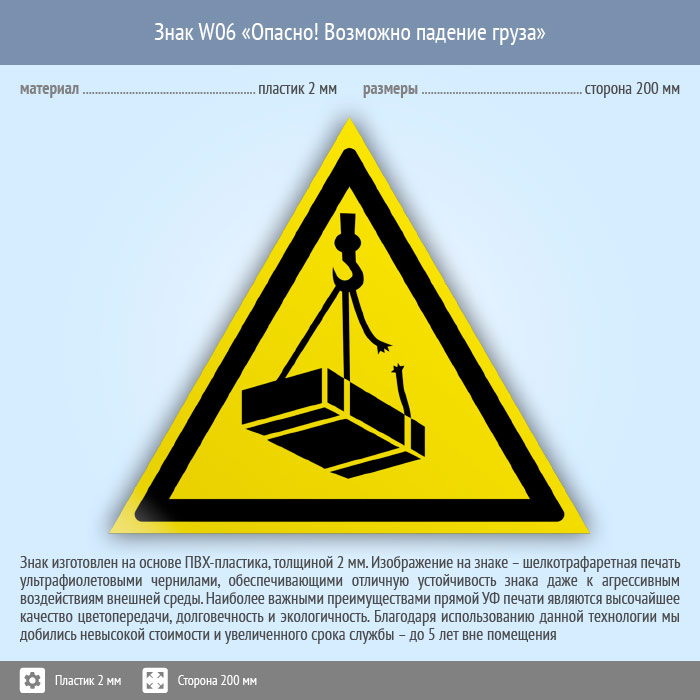 Знак W06 «Опасно! возможно падение груза» (пластик, сторона 200 мм) в Красноярске купить