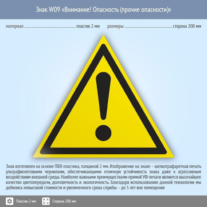 Знак W09 «Внимание! опасность (прочие опасности)» (пластик, сторона 200 мм) в Красноярске купить