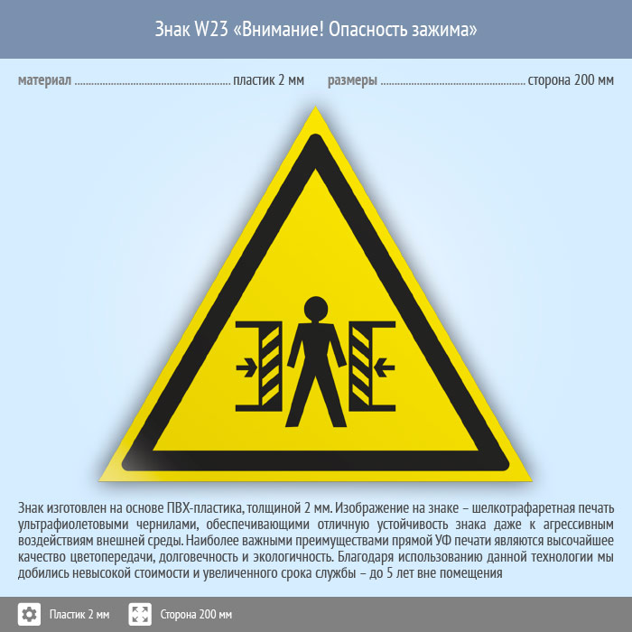 Знак W23 «Внимание! опасность зажима» (пластик, сторона 200 мм) в Красноярске купить