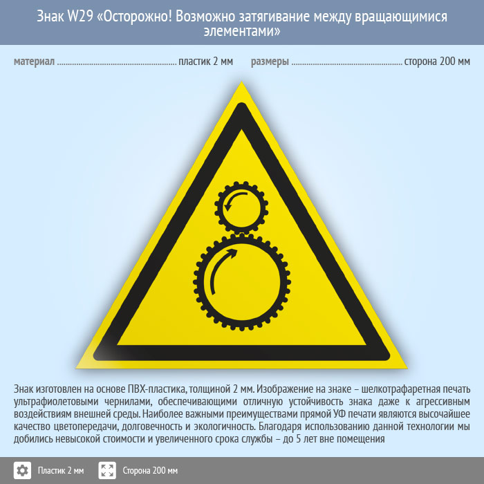 Знак W29 «Осторожно! возможно затягивание между вращающимися элементами» (пластик, сторона 200 мм) в Красноярске купить