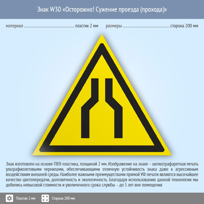 Знак W30 «Осторожно! сужение проезда (прохода)» (пластик, сторона 200 мм) в Красноярске купить