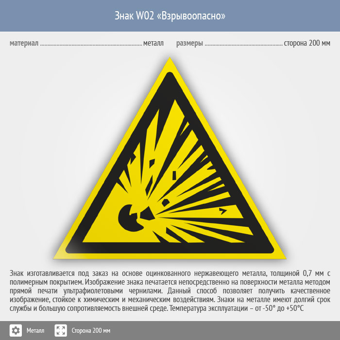 Знак W02 «Взрывоопасно» (металл, сторона 200 мм) в Красноярске купить