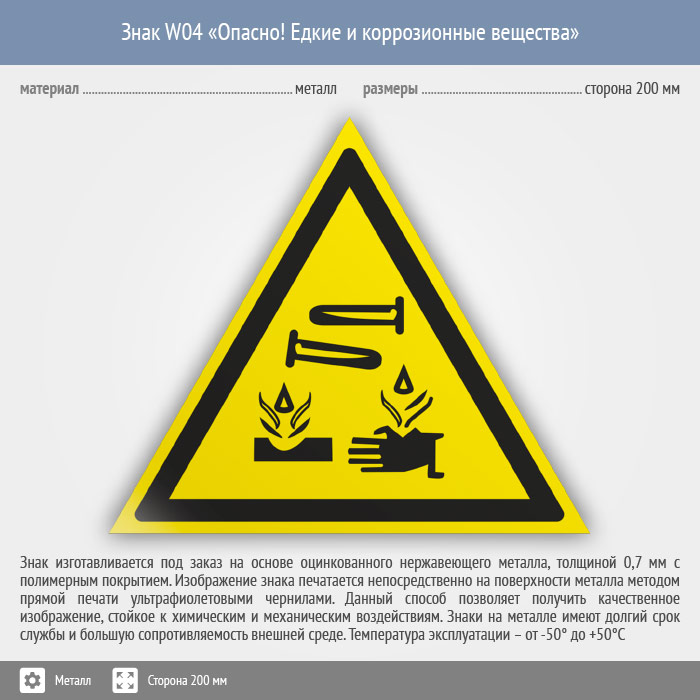 Знак W04 «Опасно! едкие и коррозионные вещества» (металл, сторона 200 мм) в Красноярске купить