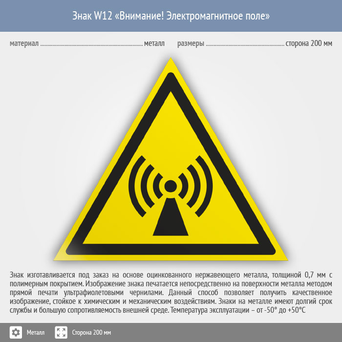 Знак W12 «Внимание! электромагнитное поле» (металл, сторона 200 мм) в Красноярске купить