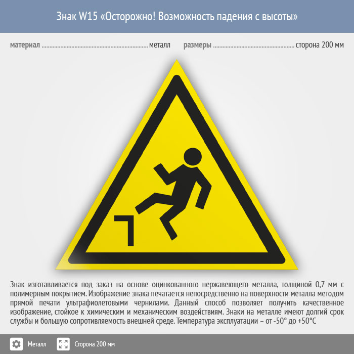 Знак W15 «Осторожно! возможность падения с высоты» (металл, сторона 200 мм) в Красноярске купить