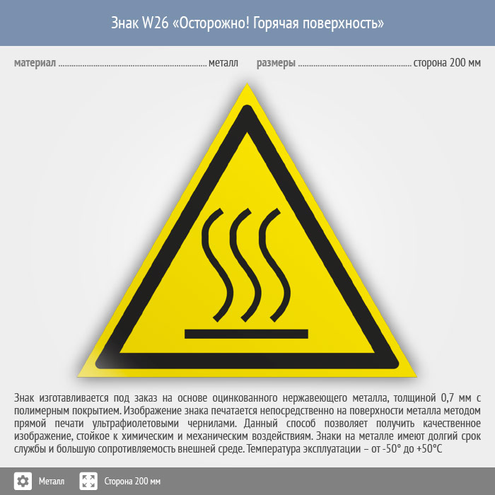 Знак W26 «Осторожно! горячая поверхность» (металл, сторона 200 мм) в Красноярске купить