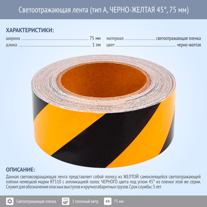 Светоотражающая сигнальная лента (тип А, ЧЕРНО-ЖЕЛТАЯ 45°, 75 мм х 1 п.м.) в Красноярске купить