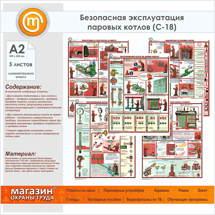 Плакаты «Безопасная эксплуатация паровых котлов» (С-18, ламинированная бумага, А2, 5 листов) в Красноярске купить