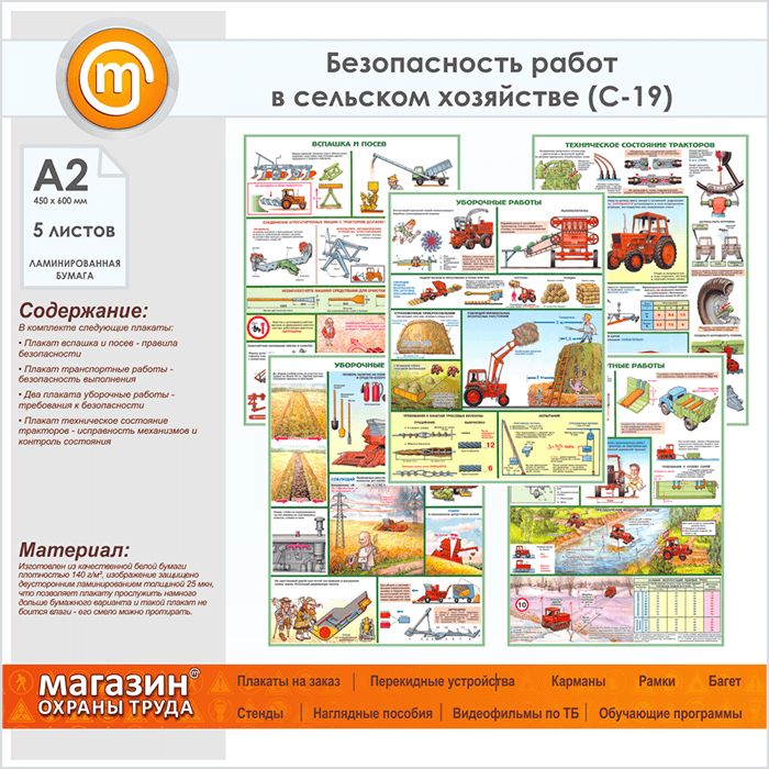 Плакаты «Безопасность работ в сельском хозяйстве» (С-19, ламинированная бумага, А2, 5 листов) в Красноярске купить