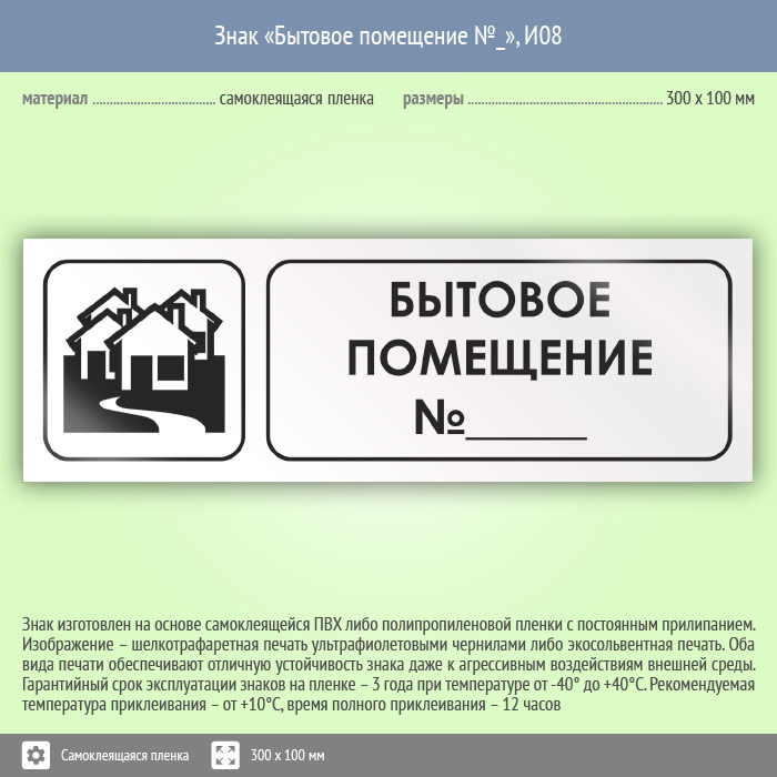 Знак «Бытовое помещение №_» может быть изготовлен любого размера на самоклеящейся пленке, пластике толщиной 0.5, 2 или 4 мм и металле. Также возможно применение фотолюминесцентных и световозвращающих материалов