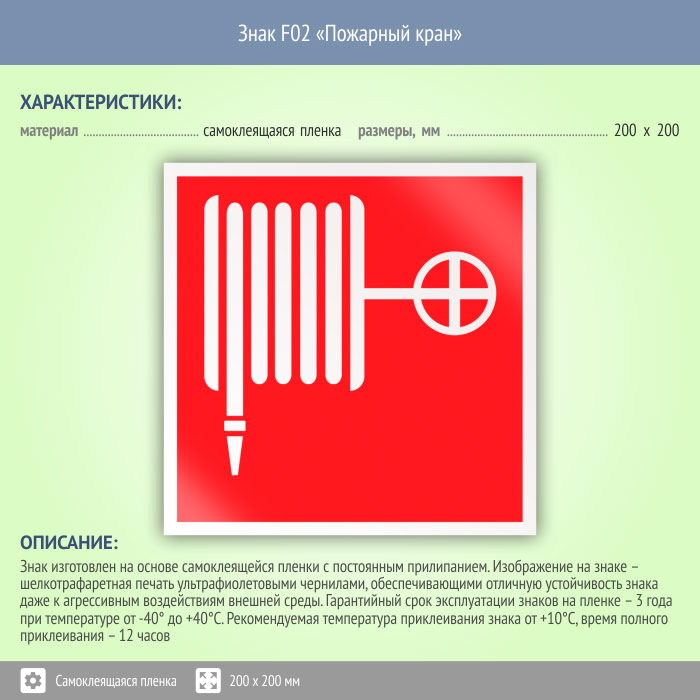Знак F02 «Пожарный кран» (С/О пленка, 200х200 мм)