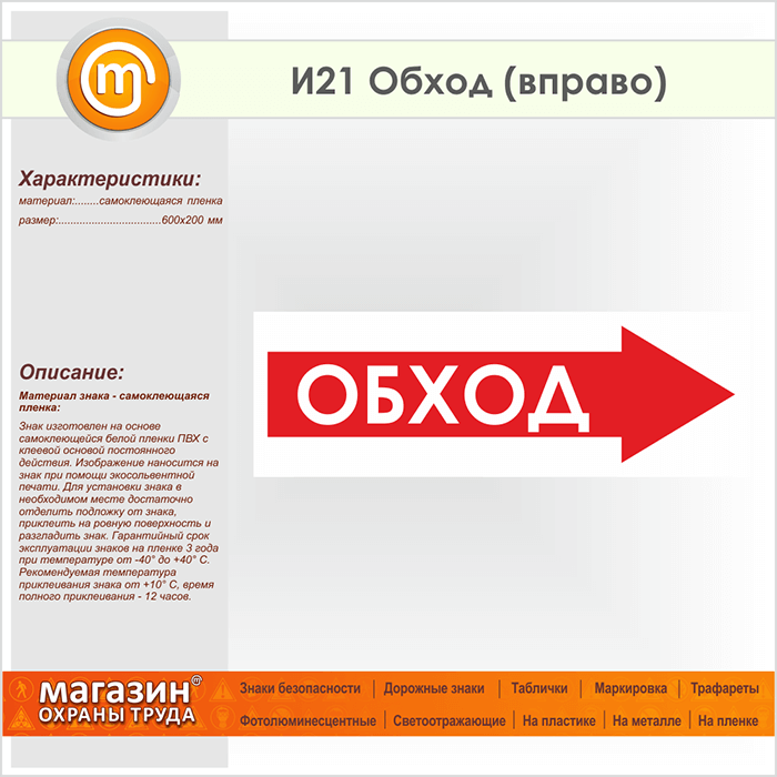 Знак «Обход (вправо)» может быть изготовлен любого размера на самоклеящейся пленке, пластике толщиной 0.5, 2 или 4 мм и металле. Также возможно применение фотолюминесцентных и световозвращающих материалов