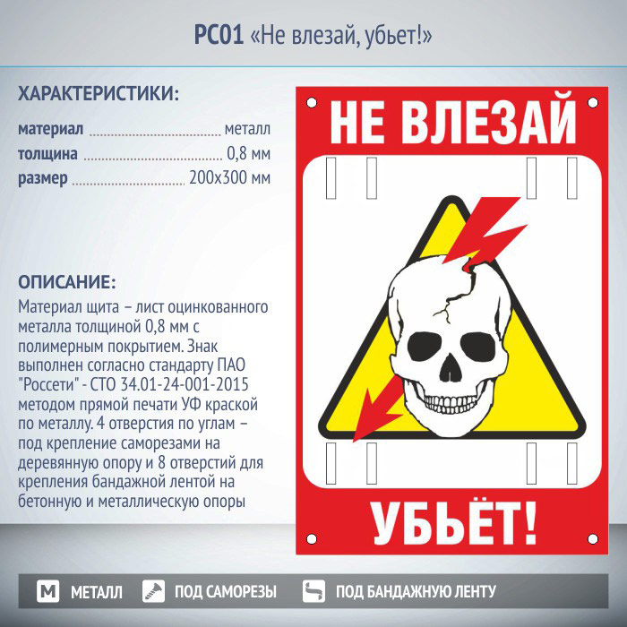 Знак «Не влезай, убьет!», РС01 (металл, 200х300 мм, отверстия под бандажную ленту) в Красноярске купить