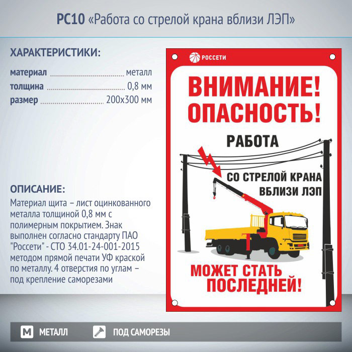 Знак «Работа со стрелой крана вблизи ЛЭП», РС10 (металл, 200х300 мм, отверстия под саморезы) в Красноярске купить