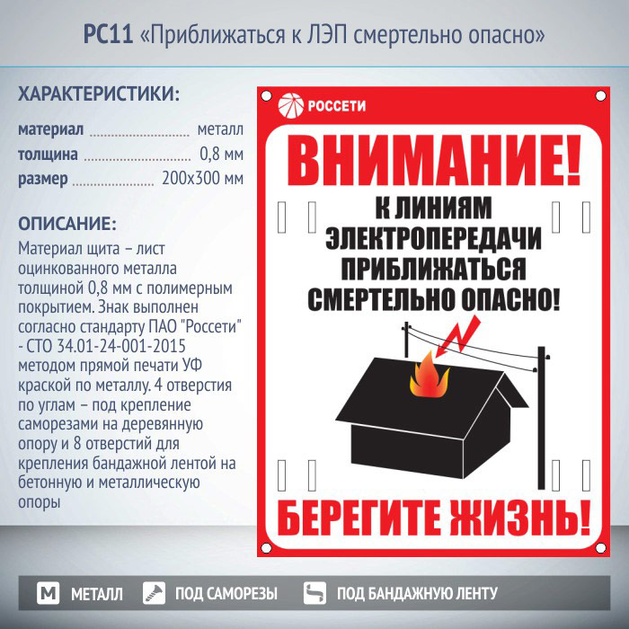 Знак «Приближаться к ЛЭП смертельно опасно», РС11 (металл, 200х300 мм, отверстия под бандажную ленту) в Красноярске купить