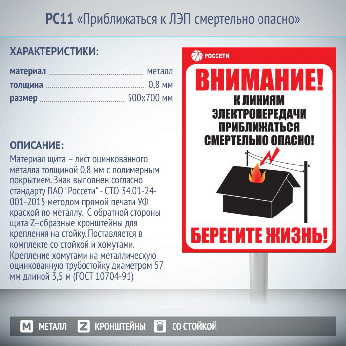 Информационный щит «Приближаться к ЛЭП смертельно опасно», РС11 (металл, 500х700 мм, с металлической стойкой) в Красноярске купить