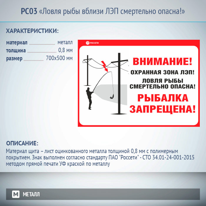 Информационный щит «Ловля рыбы вблизи ЛЭП смертельно опасна!», РС03 (металл, 700х500 мм) в Красноярске купить