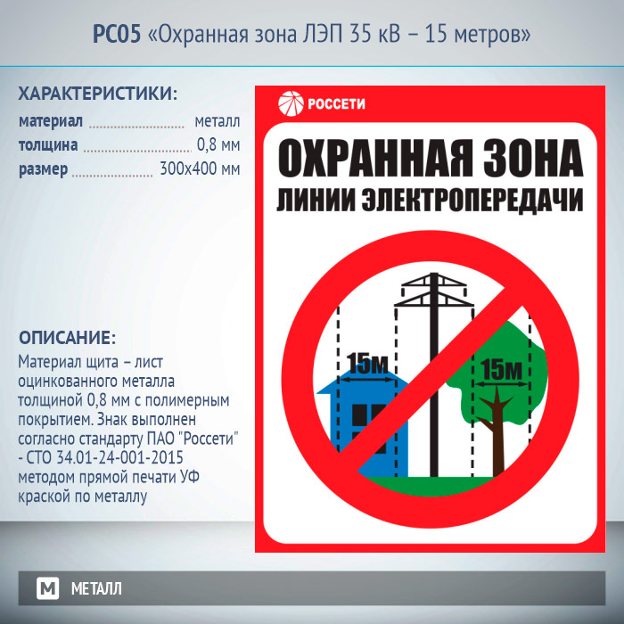 Знак «Охранная зона ЛЭП 35 кВ – 15 метров», РС05 (металл, 300х400 мм) в Красноярске купить